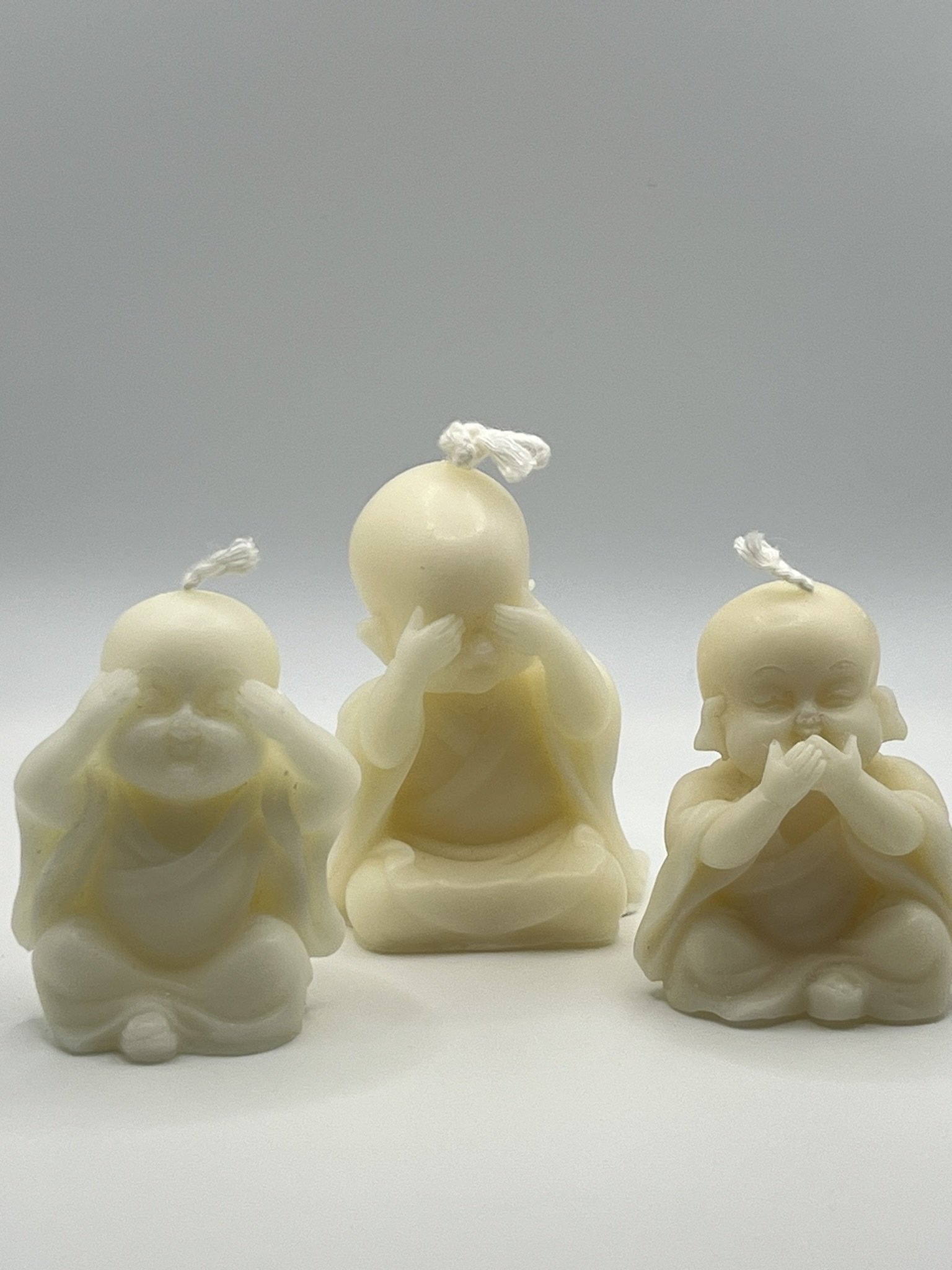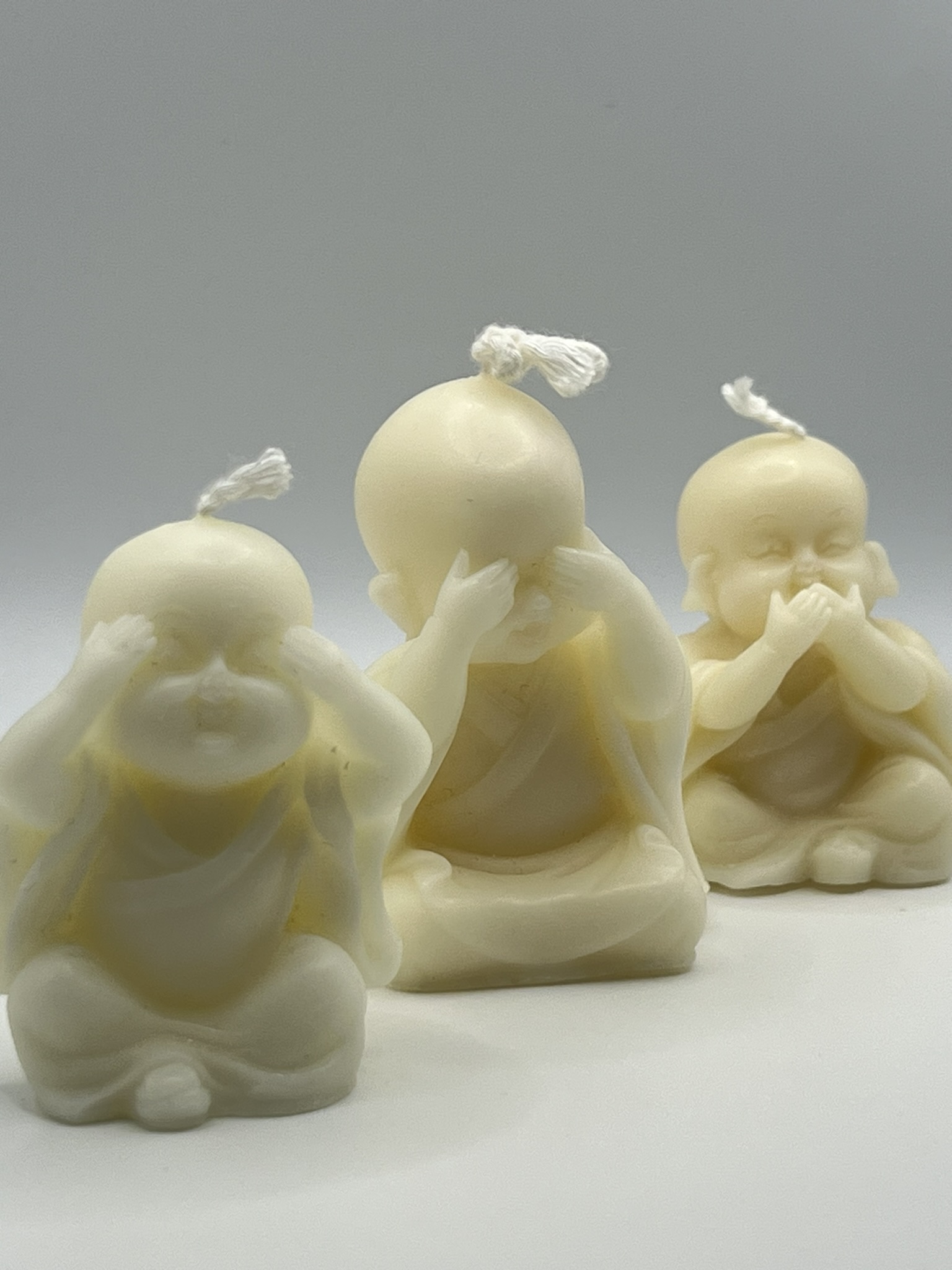 Chaque bougie est méticuleusement conçue pour représenter un Bouddha différent, symbolisant les trois principes fondamentaux de la sagesse : « Voir le Bien », « Entendre le Bien » et « Parler le Bien ». Ces figures emblématiques apportent une ambiance apaisante et invitent à la méditation, tout en décorant élégamment votre espace de vie.